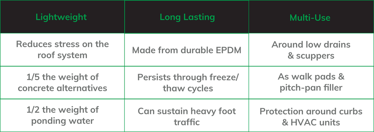GreenSlope: ~2 lbs/ sq ft. Made from lightweight rubber and expanded polystyrene, the GreenSlope roof leveling compound is ¹/₅ the weight of concrete.